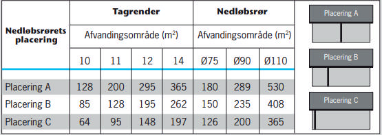 I tabellen kan du aflæse systemets afvandingskapacitet i forhold til nedløbsrørets placering. Hvis afvandingsområdet er større end tallene i tabellen, kan du vælge at installere et ekstra nedløbsrør, da det øger afvandingskapaciteten. Sørg for at planlægge afløbsmuligheder til samtlige nedløbsrør.