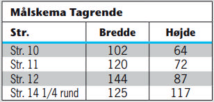 Systemstørrelserne er tilpasset forskellige hustyper. En str. 10 tagrende monteres på mindre bygninger, som fx fritidshuse samt terrasse- og udestuetage. Str. 11 anvendes til traditionelle hustyper, og str. 12 monteres på større bygninger, som udlejningsejendomme samt lager- og industrilokaler. For at sikre at du har tilstrækkelig afvandingskapacitet, bør du tage udgangspunkt i nedenstående udregninger.